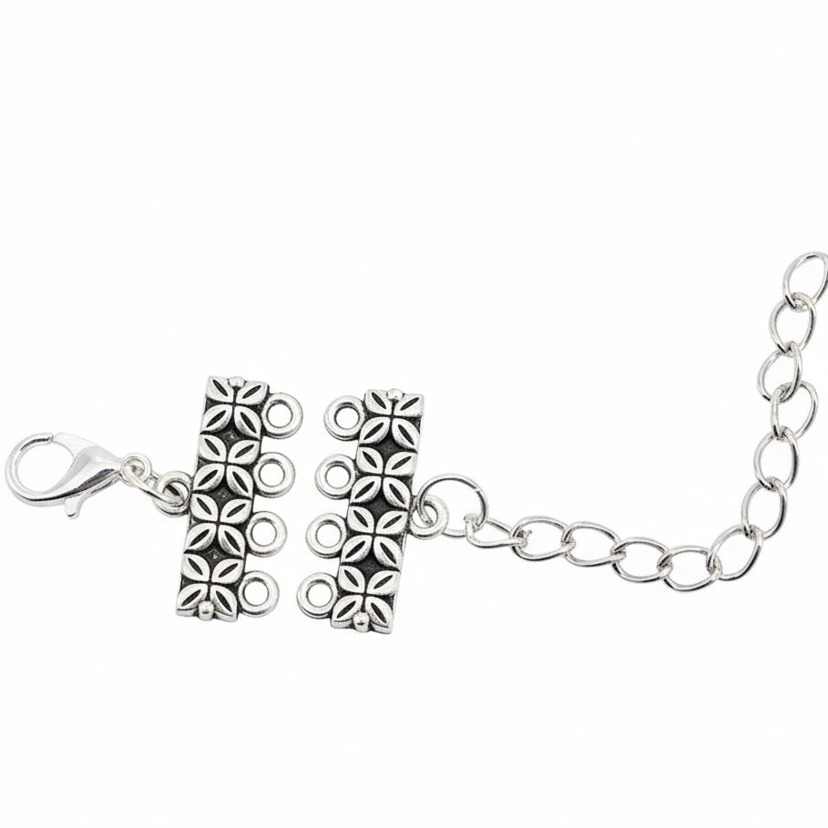 Antique silver extension chain finding with elegant Four-hole design and multiple connector loops, ideal for adjustable necklace and bracelet making with a secure lobster clasp.
