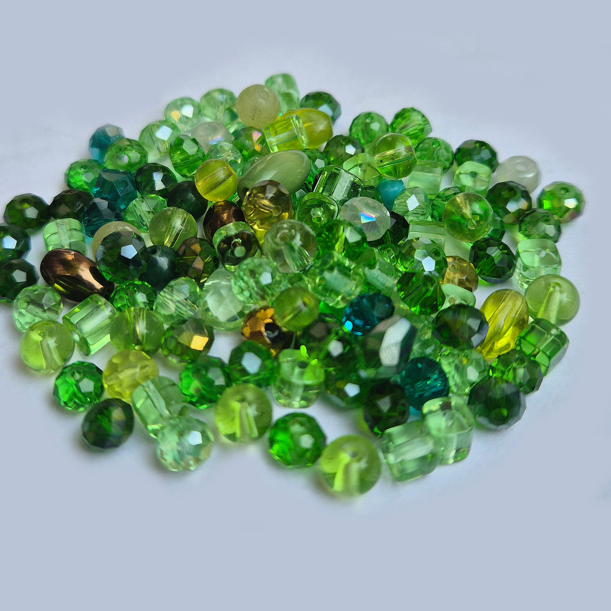 50 Grams Pkg. Crystal Glass Beads 4–7mm | Mixed Shapes & Sizes | Premium Shiny Beads for Jewelry Making, Colour Green Tone
