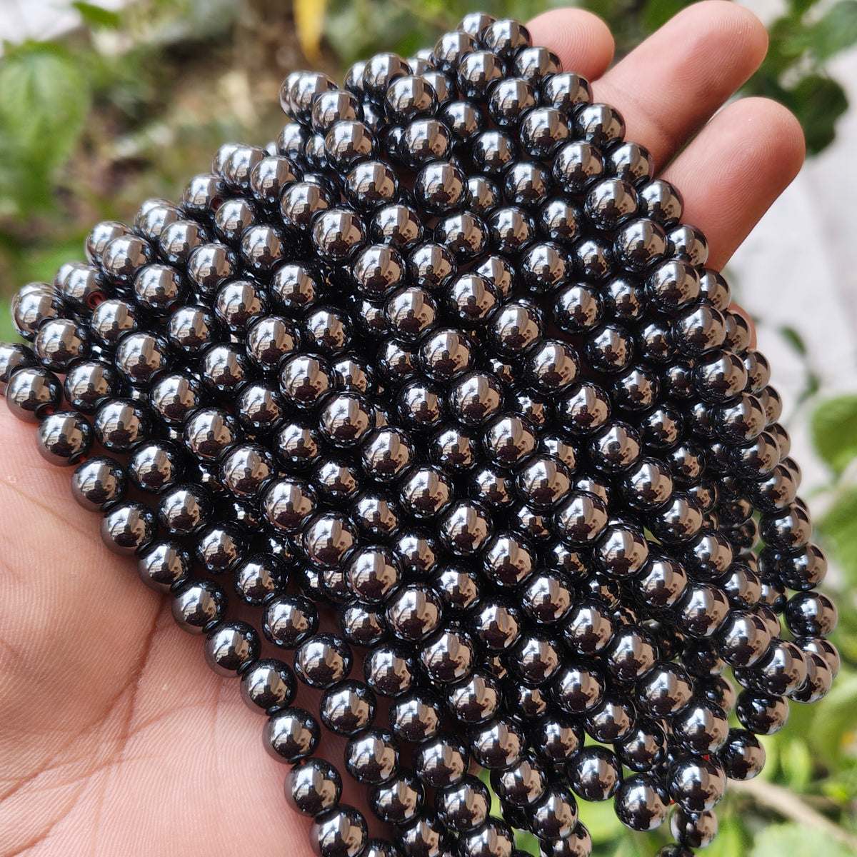 Shop our 8mm Hematite Bead String (Pack of 1). Features 50-52 genuine stone beads per line with a sleek metallic luster. Perfect for DIY jewelry making, healing bracelets, and artisanal crafts.