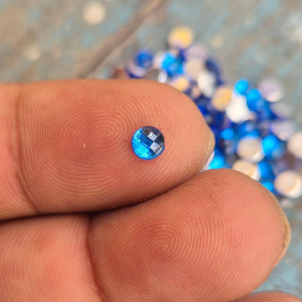 Size: 4 MMColor: BlueRound Acrylic Craft Gems Kundan Stone Used in Nail Art, Clothing, Jewelry adornment, Crafts etc. Not adhesive Flat Back can use glue to finish your project